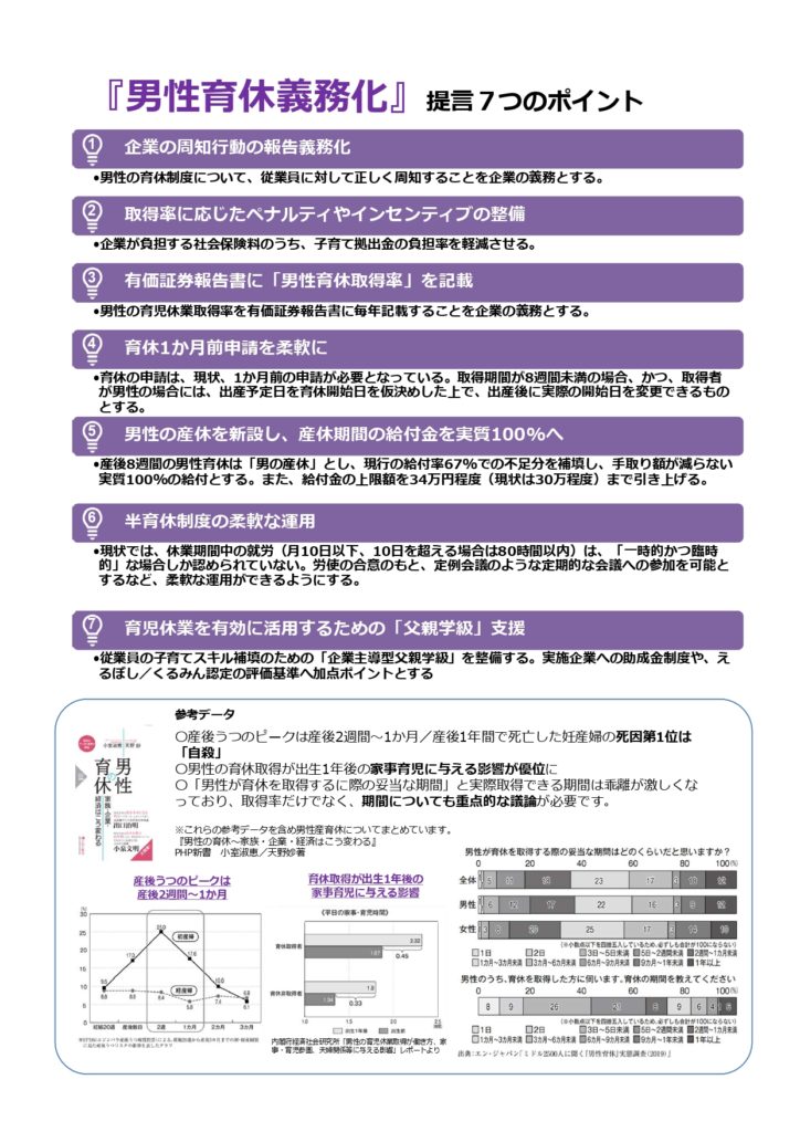 「義務化」について、色々な情報や意見が飛び交う中、男性育休義務化プロジェクトチームから、具体的な7つの提言が発表されました。